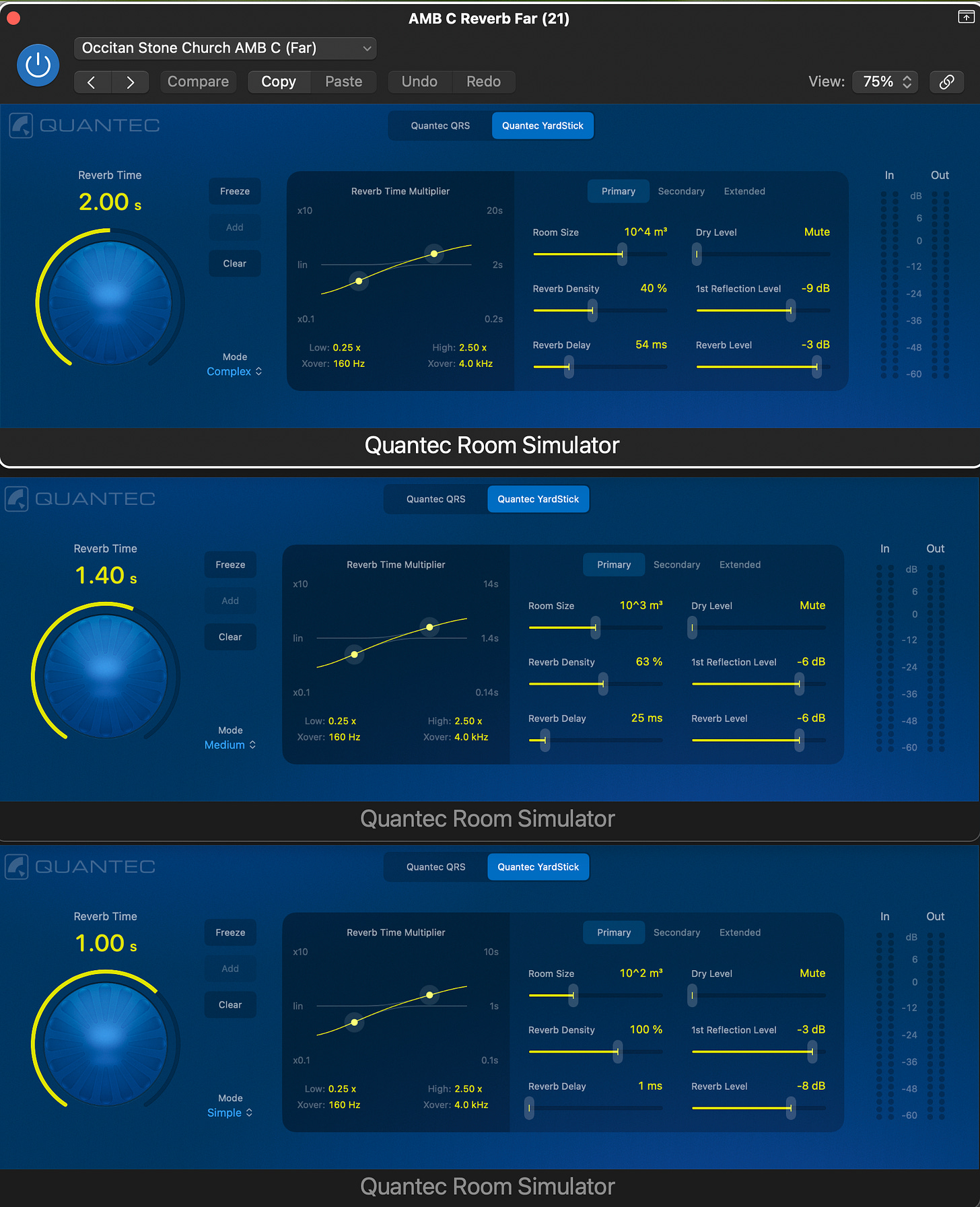Since this is the geeky-details section of the post, here’s a snapshot of the setup. The three reverbs are in the order Far (at the top), Mid (in the middle) and Close (at the bottom). You’ll see that the Room Size, Reverb Time and Reverb Delay (pre-delay) get lower as the reverb gets “closer”. All three reverbs have low-frequencies reduced and higher ones boosted, since I’m using the reverbs for extra “air” as well as sound location.